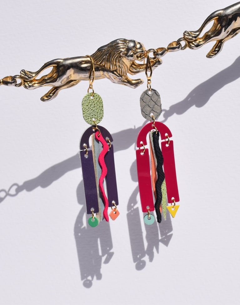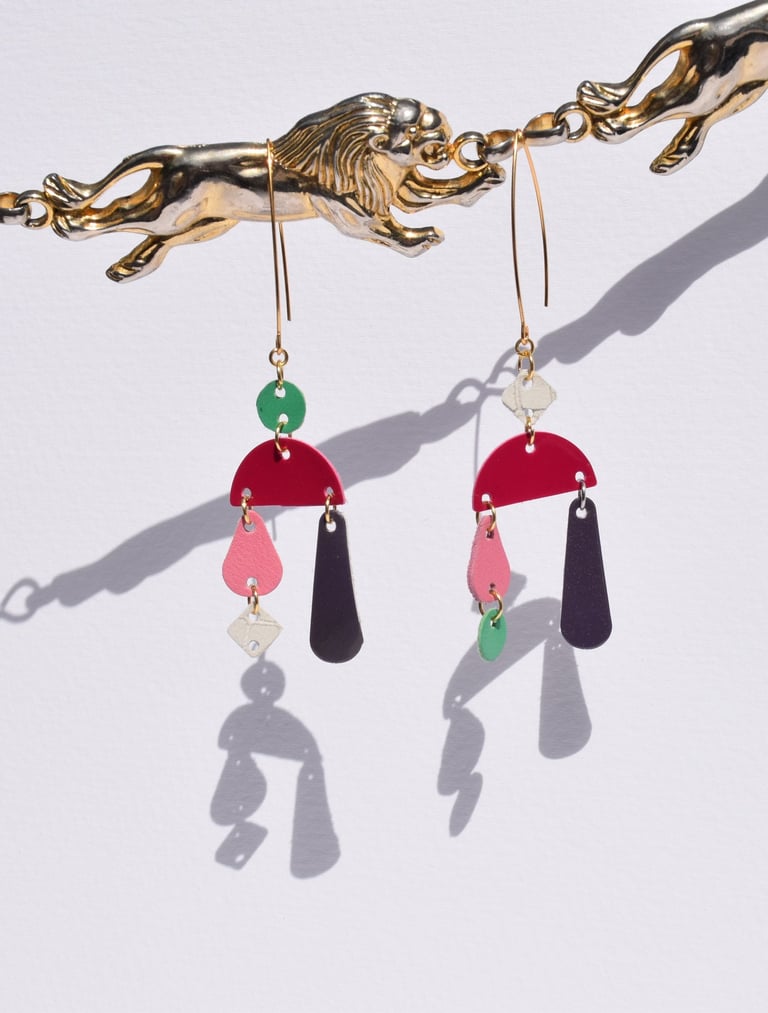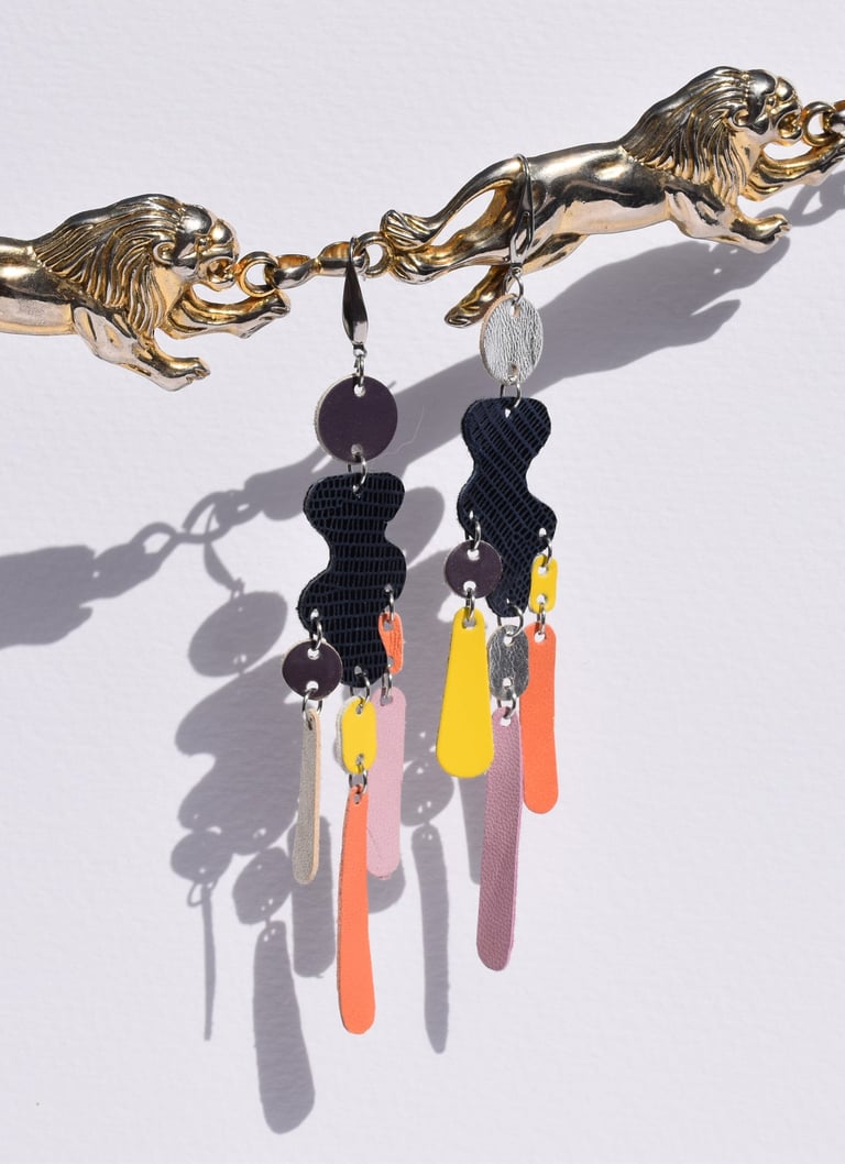 🜬 Están elaborados con retales de cuero de diferentes colores y texturas. Los enganches de acero inoxidable les aportan durabilidad, mantienen su color original y evitan las reacciones alérgicas de las orejitas más sensibles.
